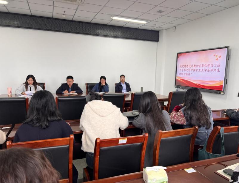 会上,姚令华带领全体教师深入学习了“习近平总书记给中国农业大学全体师生的回信精神”。他强调,作为农林类高校的专业教师,必须深刻领会回信的核心要义,坚守“知农爱农”初心,持续提升业务能力与教学水平,深入推进学科交叉融合,致力于培养能够担当民族复兴大任、适应新时代发展需求的设计专业人才。与会同志进行了交流发言。
