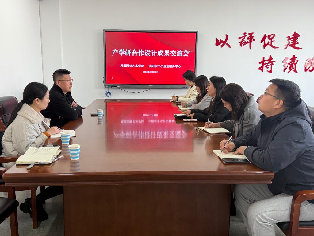12月10日,风景园林艺术学院与信阳市中小企业服务中心联合举办产学研合作设计成果交流会,集中展示基于社会真实需求开展的项目式教学成果。河南鑫传奇娱乐设备有限公司总经理、信阳市中小企业服务中心代表、学院副院长葛晖及师生代表共同参会,围绕企业产品升级的设计方案进行深入研讨。