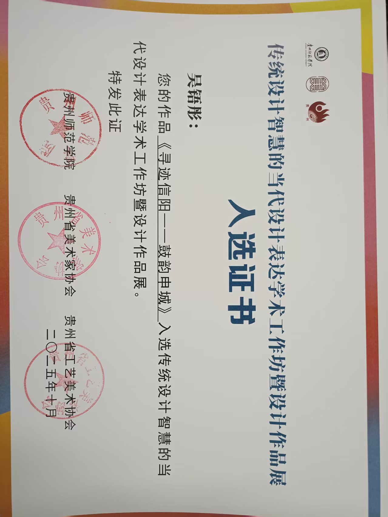 近日,由贵州省美术家协会、贵州省工艺美术协会、贵州师范学院联合主办的“传统设计智慧的当代设计表达学术工作坊暨设计作品展”入选结果揭晓,我院吴铻彤(指导教师:陈美序)、许毓菡(指导教师:康莉)、韩晓冉(指导教师:刘鸣鸣)、史奇玉(指导教师:刘昂)四位同学的作品凭借对传统设计智慧的创新诠释成功入选,充分展现了必赢766net手机版在设计专业教学与实践中的卓越成果。 此次作品入选,是对我院人才培养成效的有力肯定。我院始...