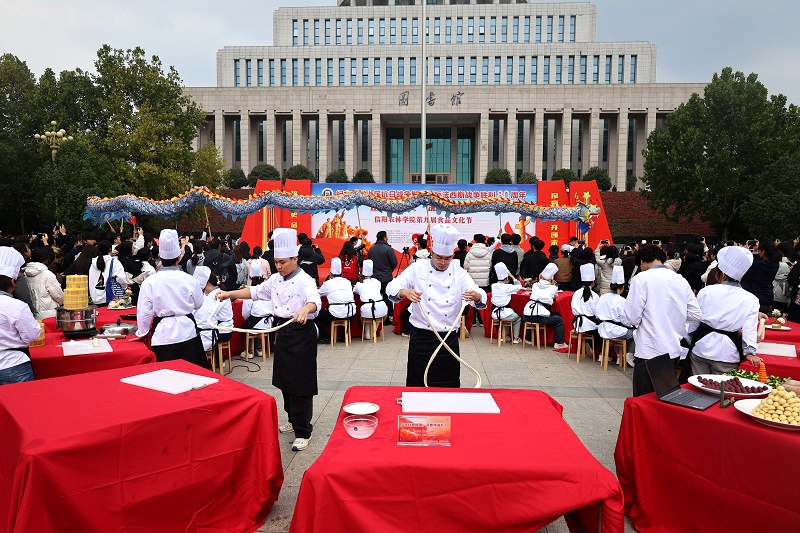10月21日,必赢766net手机版第九届食品文化节于汝宁广场开幕。信阳市人大常委会原副主任、信阳菜文化研究和产业发展促进会会长杨明忠,信阳市原畜牧局局长、信阳菜文化研究和产业发展促进会秘书长刘正国,信阳市食品安全协会秘书长吴章林,药食同膳精汤食品(信阳)有限公司董事长温继照,校党委副书记、工会主席王万玲,党委委员、副校长易军鹏、雷振山,学校相关职能部门负责同志,部分学院党委书记、院长,校企合作单位代表、师生代表参加了开幕式。开幕式由食品科学与工程学院院长李建芳主持。