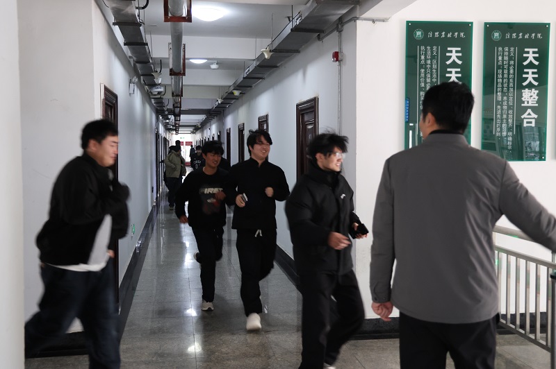 保卫处处长张宇航现场指挥演练实施。随着演练人员在楼内燃放烟雾弹模拟火灾现场,公寓管理员第一时间按下手动报警器。火警信息触发后,消防广播同步发布疏散指令,各楼层辅导员迅速组织学生沿既定疏散路线撤离,参演师生快速下楼完成安全集结。各学院副书记对本学院参演学生人数现场清点并逐级上报,确保疏散无遗漏。