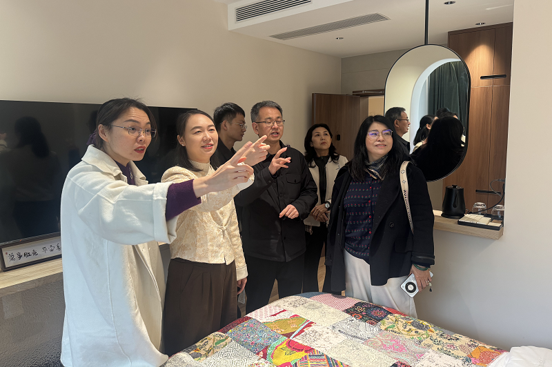 为促进本地企业间的资源共享与优势互补,10月25日下午,服务团同民宿主理人前往羿伟龙祥(河南)实业有限公司进行考察交流。三方共同观看了企业宣传片,深入了解企业概况。服务团进一步参观了鲁山绸的生产工艺流程,并详细了解了柞蚕丝绸文化博物馆的建设筹备情况。在此基础上,服务团积极推动民宿与丝绸产品企业间的合作商讨,探索“民宿+丝绸”主题体验、产品展销等联动模式,旨在拓展彼此的业务边界。