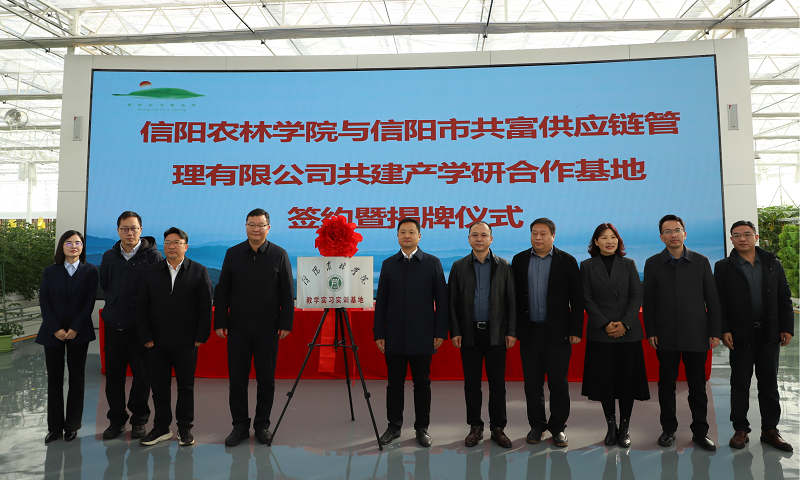 仪式上,园艺学院院长龚守富与信阳市共富供应链管理有限公司总经理王峰代表双方签约。易军鹏与滕祥麟共同为产学研合作基地揭牌。