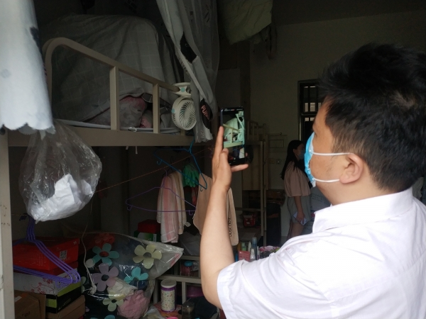 在宿舍区,毕业班辅导员与返校的同学们一起,通过视频连接的方式,帮助未能返校的学子们,仔细清点个人物品,认真收拾打包。