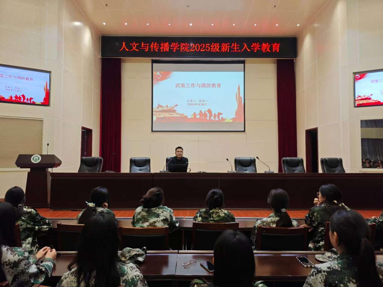 为帮助2025级新生深入了解国防建设意义、明晰参军发展路径,人文与传播学院于9月23日下午,在图书馆六楼报告厅开展的新生入学主题教育中,特设国防武装专题宣讲环节,由余功一老师主讲,2025级全体身着军训服装的新生全程参与。