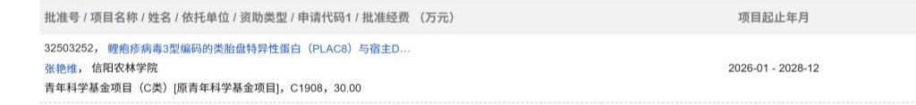 今天上午,国家自然科学基金委员会发布了《关于2025年国家自然科学基金集中接收申请项目评审结果的通告》。我院张艳维博士申报的《鲤疱疹病毒3型编码的类胎盘特异性蛋白(PLAC8)与宿主DDX5互作调控病毒复制的分子机制》获批青年科学基金项目(C类)[原青年科学基金项目],直接经费30万元。该项目是水产学院第一项国家基金,实现了学院国家基金零的突破。学院也将以此为契机,继续完善科研管理体系,强化有组织的科研,力争在未来产出更多高质量成果,持续提升学科建设与人才培养质量。