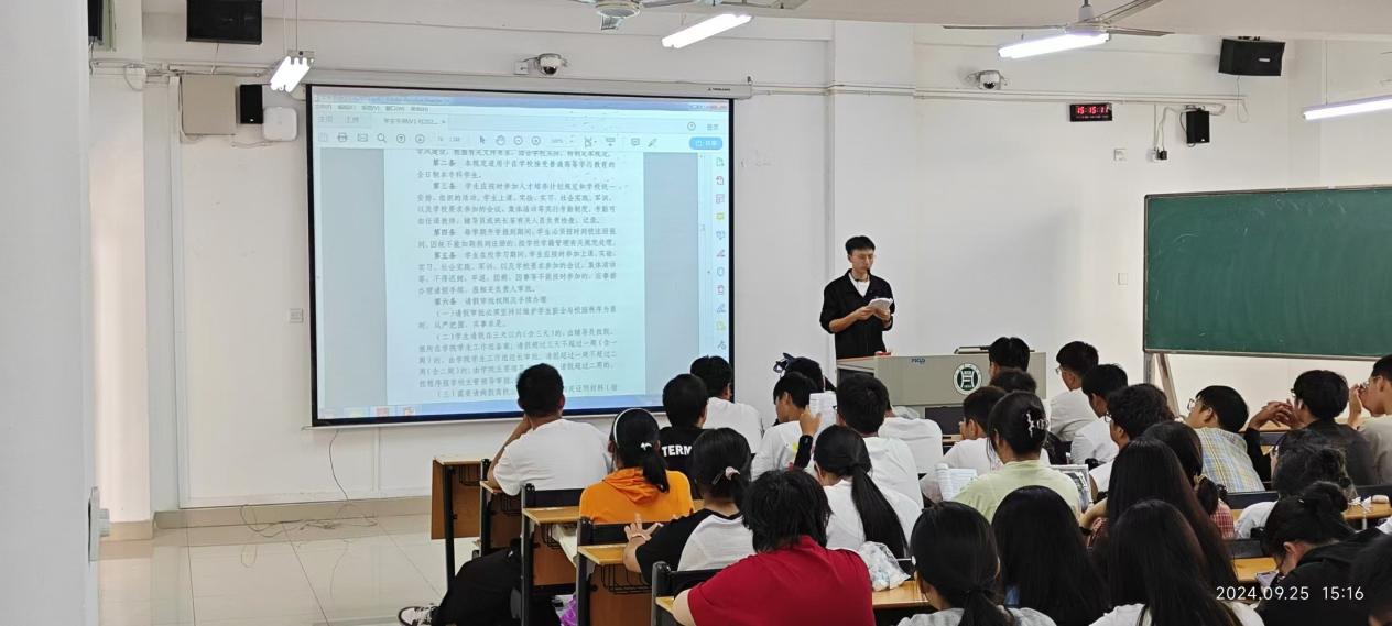 为帮助新生进一步了解学校规章制度,树立规矩意识,尽快转变角色适应大学生活,水产学院于9月25日下午在二教113开展新生入学教育之学生手册学习讲座,本次讲座由专职辅导员彭冶主讲,水产学院2024级全体新生参加。