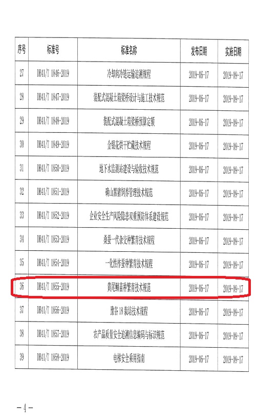 2019年6月17日,河南省市场监督管理局发布公告(2019年第38号),批准发布《农村生活污水处理设施水污染物排放标准》等39项河南省地方标准,必赢766net手机版水产学院制定的《黄尾鲴苗种繁育技术规范》名列其中,该标准将于2019年9月17日正式实施。