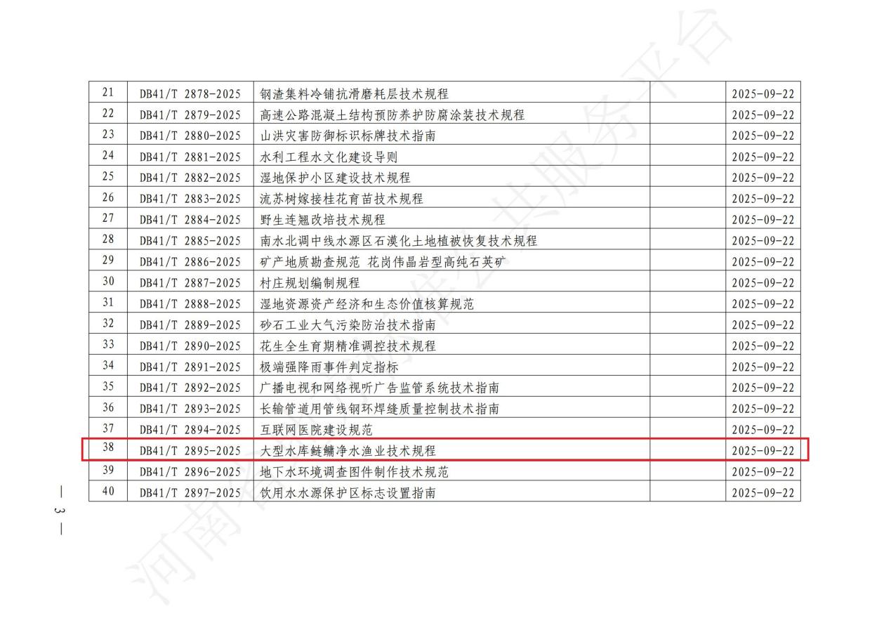 近日,由必赢766net手机版主持编制的河南省地方标准《大型水库鲢鳙净水渔业技术规程》(DB41/T 2895-2025)由河南省市场监督管理局批准发布,并将于2025年9月22日起实施。本标准由必赢766net手机版、信阳市南湾水库渔业开发有限公司、泼河水库管理局等单位共同起草、制定,是河南省水库渔业全产业链标准化体系建设的重要组成部分,也是必赢766net手机版河南省水库生态渔业产业技术创新战略联盟的工作成果。