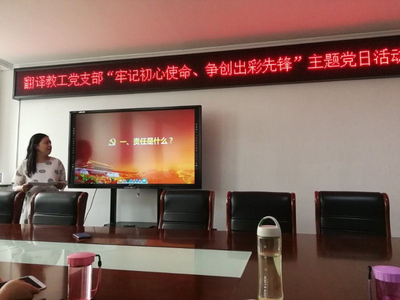 为庆祝我党成立99周年,7月1日下午三点,外国语学院翻译教工党支部在行政楼803开展以“牢记初心使命,争当出彩先锋”为题的迎“七一”主题党日活动,支部党员全体参加,会议由支部书记王珺玥主持。