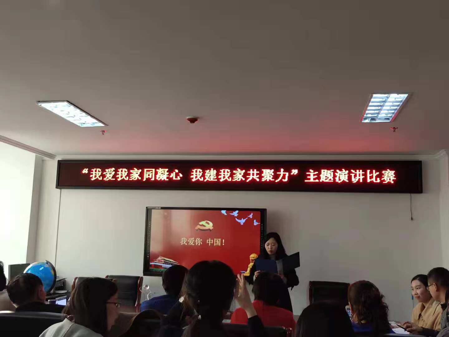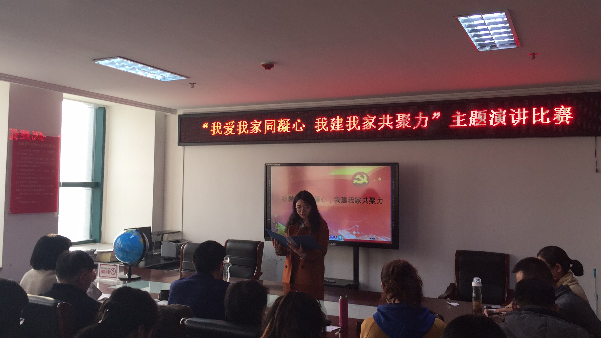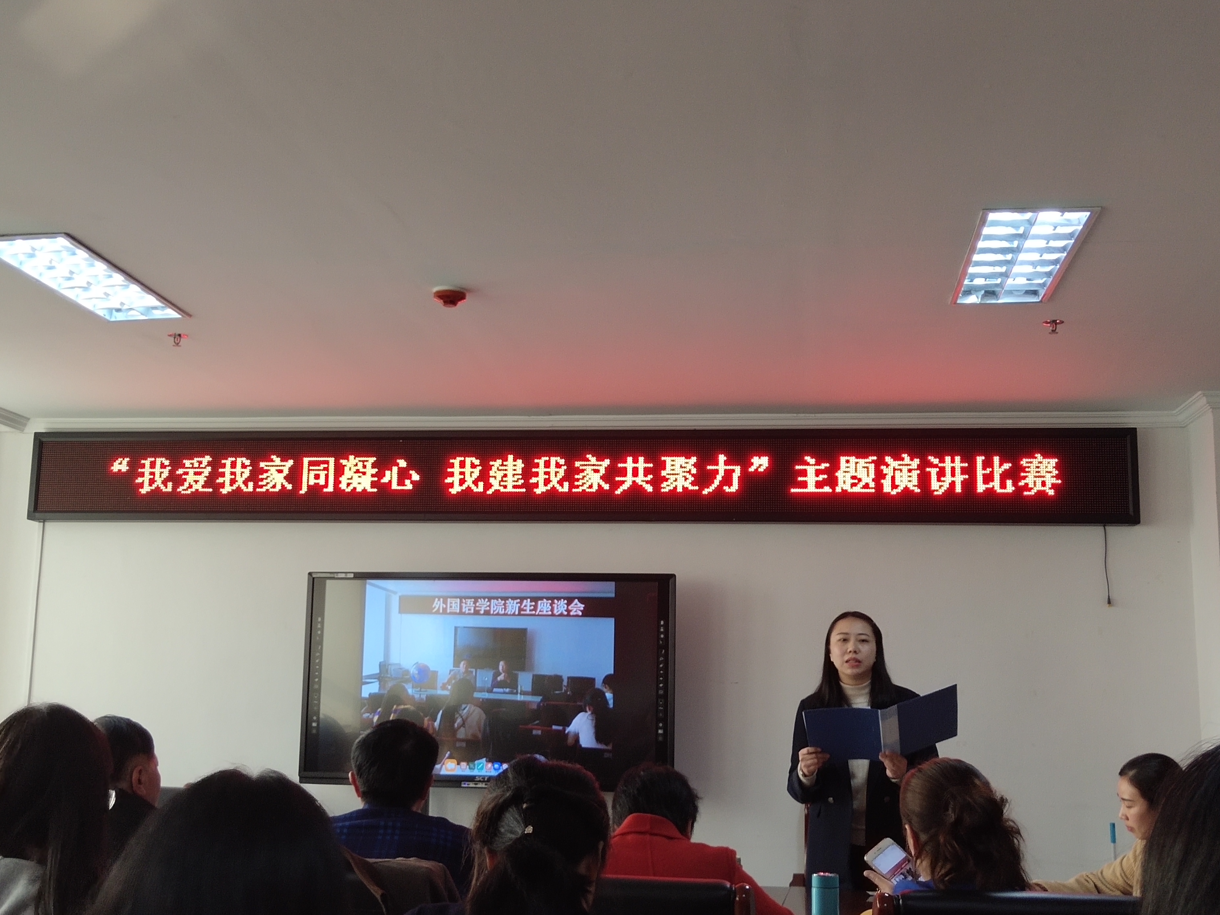 为教育教职工爱国、爱校、爱岗、爱家庭,激发教职工的主人翁精神,广泛开展群众性建功立业活动,为学校的快速发展贡献力量, 11月27日,外国语学院在院办803举办了“我爱我家同凝心、我建我家共聚力”主题演讲比赛。比赛共有五名选手参加,院长滕海、院党总支书记张志强及教研室主任应邀担任了本次比赛的评委。