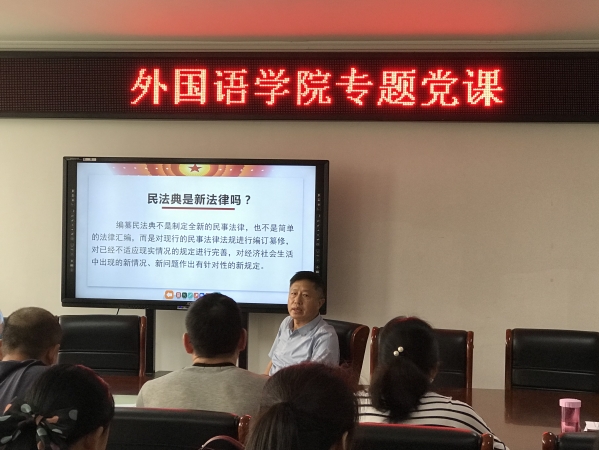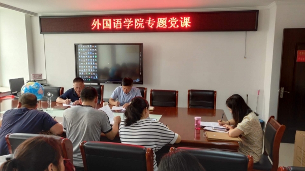 6月16日下午,外国语学院党总支书记张志强在院办803为全体教工党员讲授专题党课。