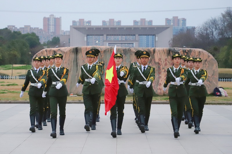 7时整,伴随着雄壮的《义勇军进行曲》,鲜艳的五星红旗冉冉升起、迎风飘扬。全体师生目光坚定,向国旗行注目礼,齐唱国歌。