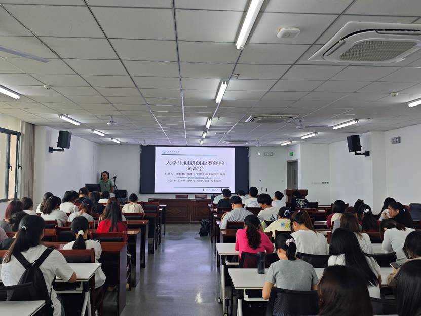陈松楠博士以“大学生创新创业大赛参赛经验”为主题,详细解读了大赛的规则、流程和评审标准,并结合其丰富的参赛经历,详细阐述了优质项目的技术特点、PPT制作要点、网络评审材料的关键要素、路演汇报技巧等关键内容,为与会者提供了具有高度实用性的指导。赵依欣、易雅馨两位同学也分享了她们在赛事中打磨获奖作品的心得与实践经验。在交流互动环节,师生们围绕备赛中的难点痛点积极提问、深入探讨,进一步加深了对大学生创新创业大赛的理解,增强了勇于创新、敢于实践的意识。