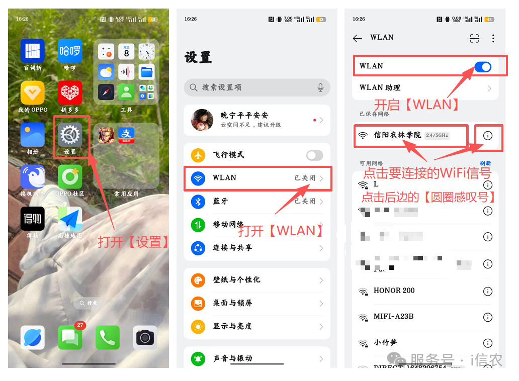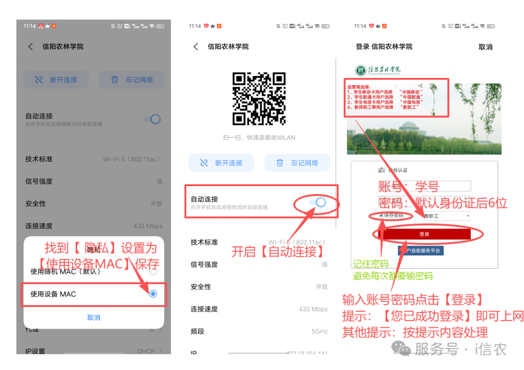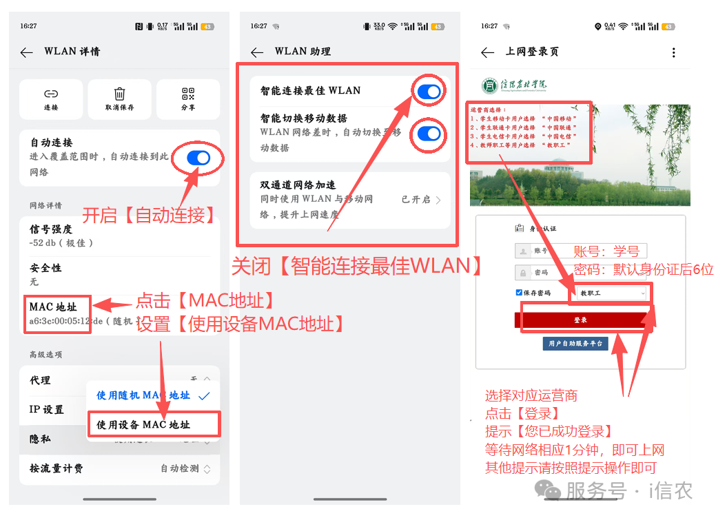 OPPO A5Pro ColorOS 15.0版本示例:打开【设置】—找到【WLAN】点击—开启【WLAN】—找到要连接的WiFi信号(比如“必赢766net手机版”或“13-110”举例)—点击WiFi后边的【圆圈感叹号】—开启【自动连接】—点击【MAC地址】—选择【使用设备MAC地址】—【保存】—找到【WLAN助理】—关闭【智能连接最佳WLAN】—设置完成后再次连接WiFi会自动跳转登陆页面—输入【账号:学号】【密码:默认身份证号后6位】—选择【对应运营商】—点击【登录】—显示【您已成功登录】代表登录成功,其他提示按提示操作。