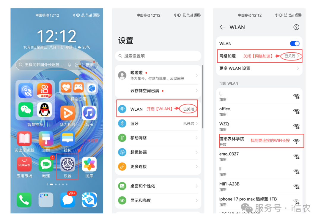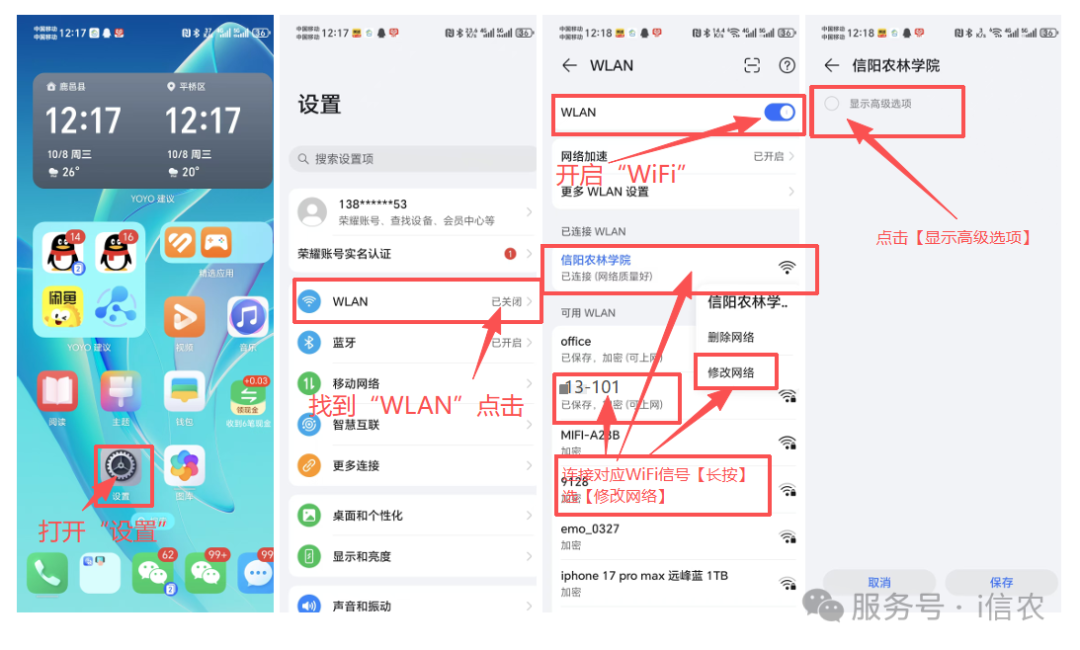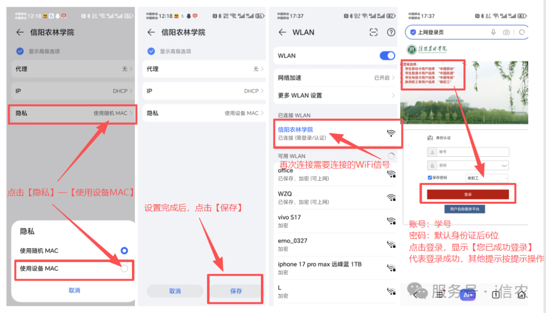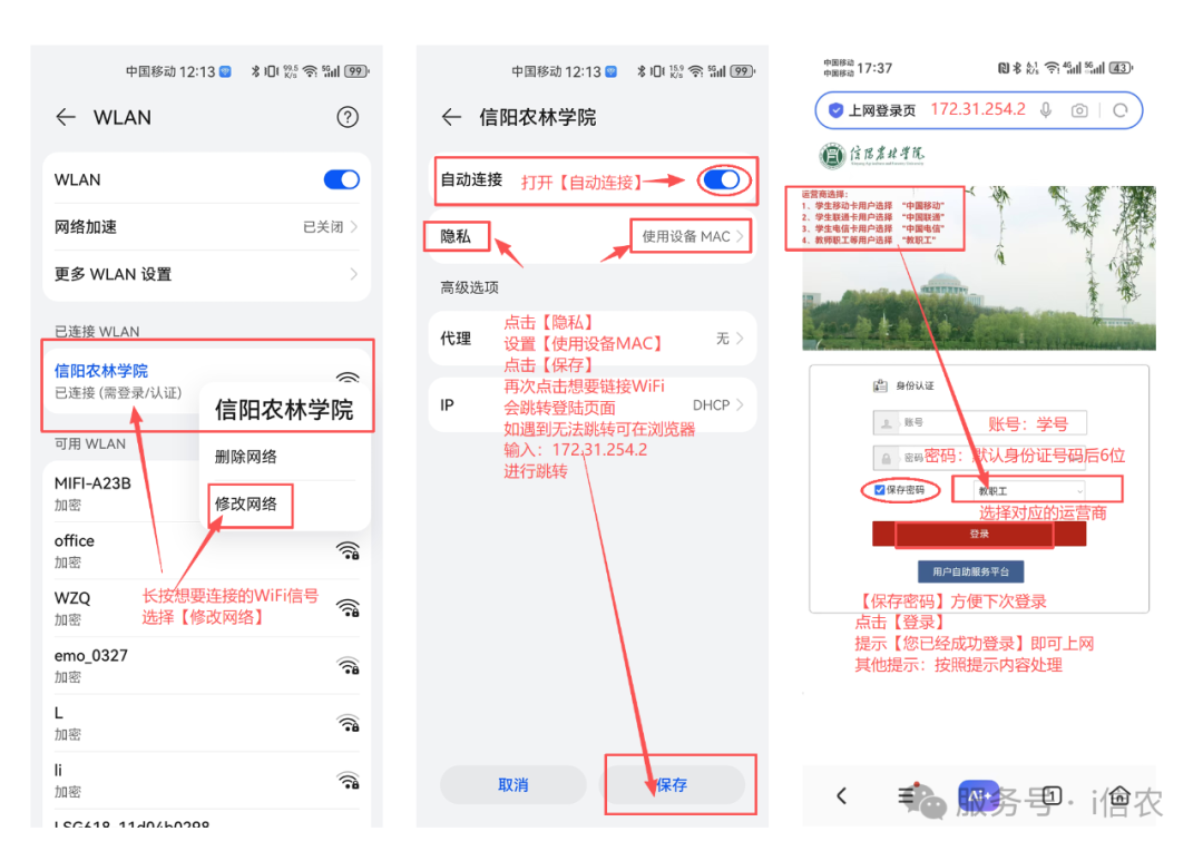 华为Mate60 HarmonyOS-4.2.0版本示例:打开【设置】—找到【WLAN】点击—开启【WLAN】—找到要连接的WiFi信号(比如“必赢766net手机版”或“13-110”举例)—长按【修改网络】—勾选【显示高级选项】—找到【隐私】—勾选【使用设备MAC】—【保存】—设置完成后再次连接WiFi会自动跳转登陆页面—输入【账号:学号】【密码:默认身份证号后6位】—选择【对应运营商】—点击【登录】—显示【您已成功登录】代表登录成功,其他提示按提示操作。