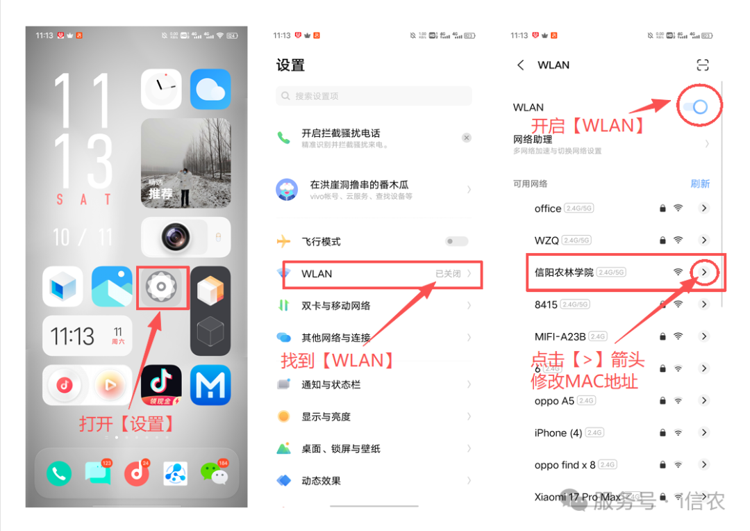 IQ00 型号OriginOS版本示例:打开【设置】—找到【WLAN】点击—开启【WLAN】—找到要连接的WiFi信号(比如“必赢766net手机版”或“13-110”举例)—点击WiFi后边的【>】—找到并点击【隐私】—选择【使用设备MAC地址】—【保存】—设置完成后再次连接WiFi会自动跳转登陆页面—输入【账号:学号】【密码:默认身份证号后6位】—选择【对应运营商】—点击【登录】—显示【您已成功登录】代表登录成功,其他提示按提示操作。