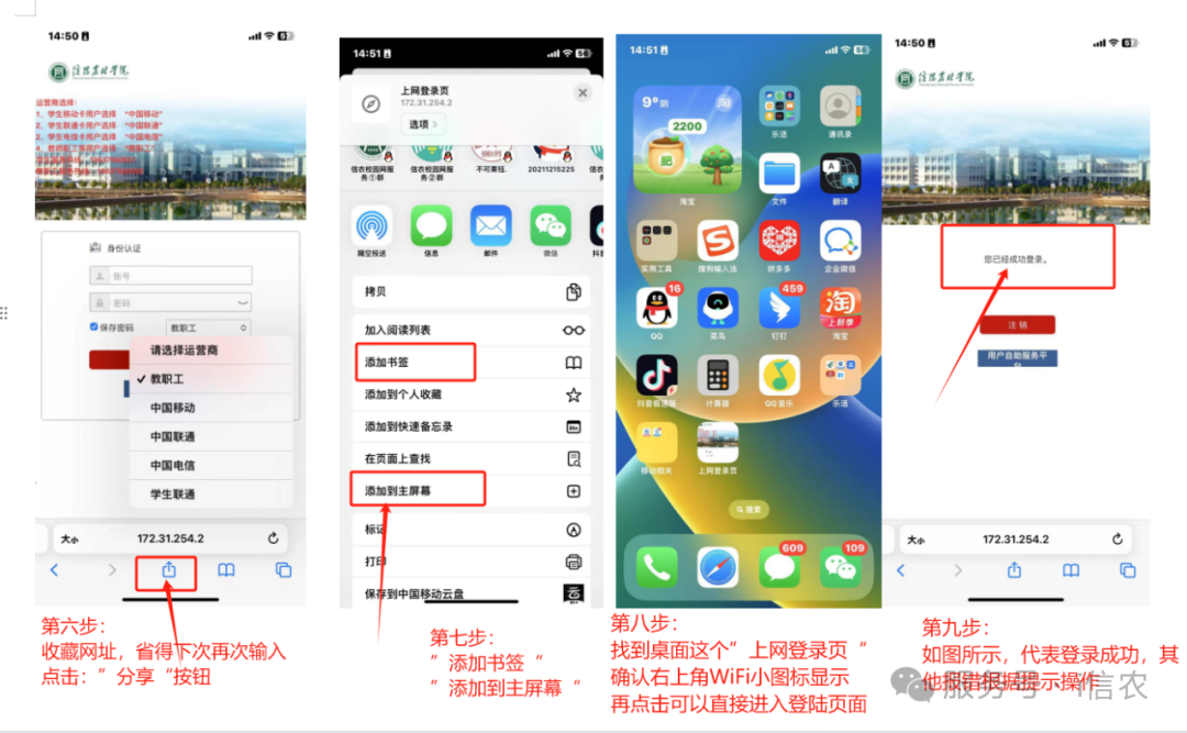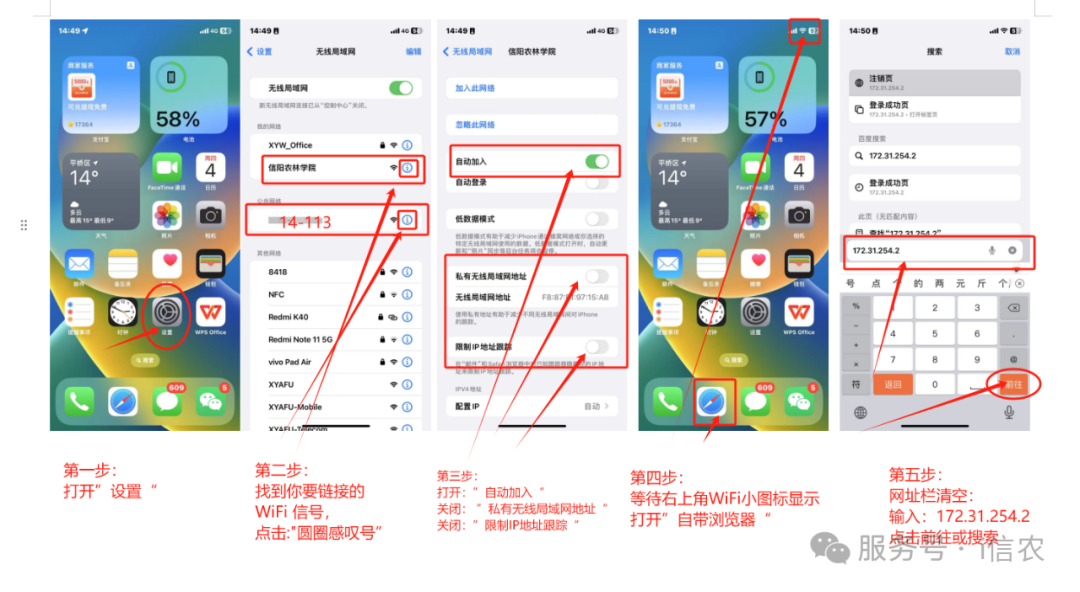 苹果11型号iOS 17 版本示例:打开【设置】—找到【无线局域网】点击—开启【无线局域网】—找到要连接的WiFi信号(比如“必赢766net手机版”或“13-110”举例)—点击WiFi后边的【圆圈感叹号】—找到【私有无线局域网地址】选择关闭—点击【允许跟踪】—确认【右上角WiFi小图标】显示—打开【自带浏览器】—【网址输入栏输入:172.31.254.2】—点击【前往或搜索】—跳转到【登陆页面】点击分享按钮【添加书签】或【添加到主屏幕】方便下次登录,打开认证页面【账号:学号或工号】【密码:默认身份证后6位】—勾选【记住密码】—【选择对应运营商】点击登录—显示【您已成功登录】,代表登陆成功,其他报错信息请按照报错提示信息处理。