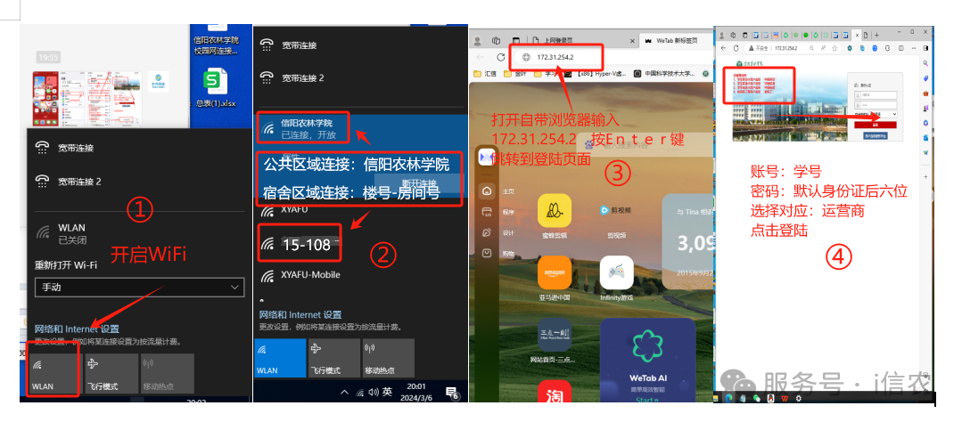 开启【WiFi】—连接对应的WiFi信号(【必赢766net手机版】或【楼号-房间号】)—确认连接成功,打开【自带浏览器】—网址清空后,输入【172.31.254.2】跳转登陆页面—输入【账号:学号】【密码:默认身份证号后6位】—选择【对应运营商】—点击【登录】—显示【您已成功登录】代表登录成功,其他提示按提示操作。