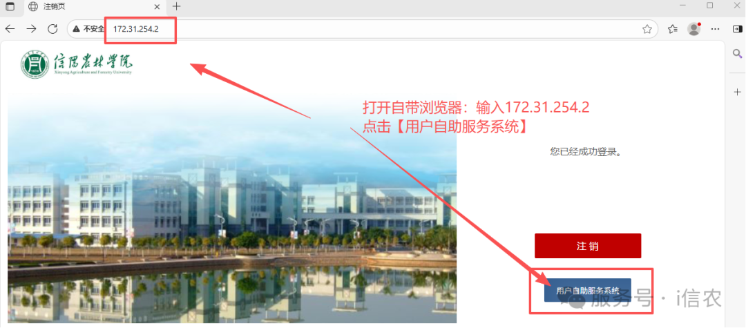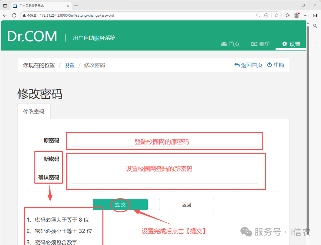 连接【校园WIFI】—打开【自带浏览器】输入【172.31.254.2】—进入【全光网登陆页面】—点击【用户自助服务系统】或在连接校园WiF前提下输入http://172.31.254.3:8080/Self/login/?302=LI —账号密码和现有的WiFi账号密码一样—点击【登录】—登陆成功后点击【设置】—点击【修改密码】—输入原密码后,按照密码修改格式要求【设置新密码】—点击【提交】,提交后需要重新使用新密码进行登录认证全光网。