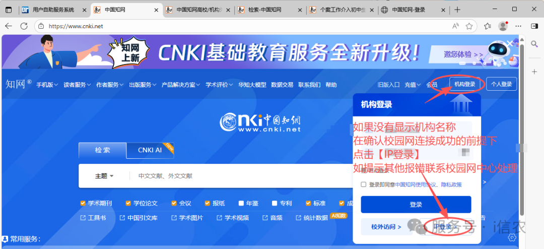 首先确认【全光网是否认证成功】,如果连接成功,打开【中国知网:https://www.cnki.net/】官网,选择要下载的文献是否可以查看和下载,如果无法访问,检查右上角【机构登录】是否为【必赢766net手机版】机构,如果不是,点击【机构登录】—点击【IP登录】,再次查看是否可以查看和下载文献。如果还有其他报错联系:图书馆4楼校园网第三方服务中心416A房间电话:19837680651