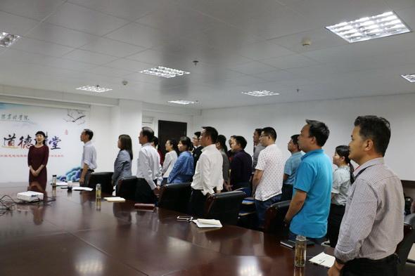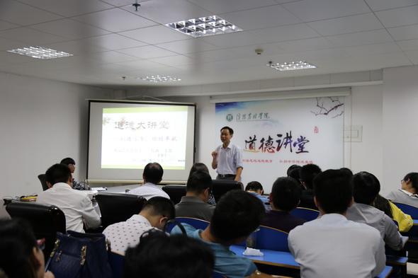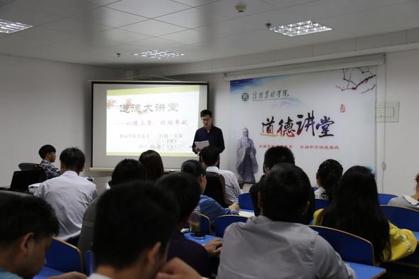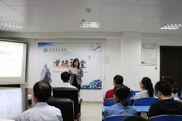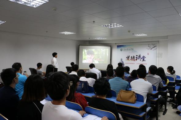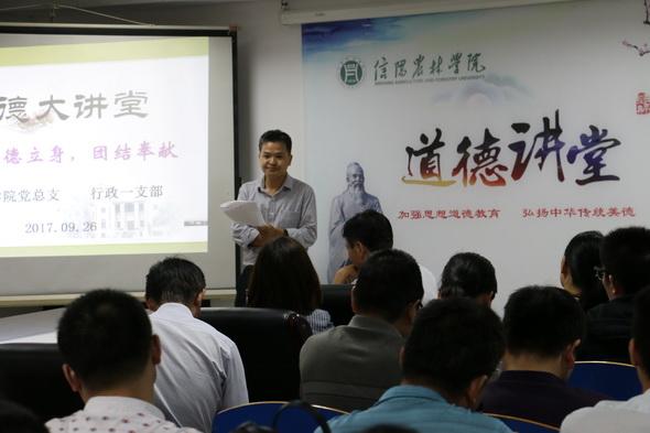 为大力弘扬中华民族的传统美德,弘扬社会正气,利用“身边人讲身边事、身边事教身边人”, 进一步提高师生的思想道德素质,加强师生的文明素养,9月26日下午,食品学院和行政一支部在行政楼第八会议室开展以“以德立身,团结奉献”为主题的道德讲堂活动。食品学院和行政一支部40余人参加了活动,活动由食品学院团总支书记刘涛主持。