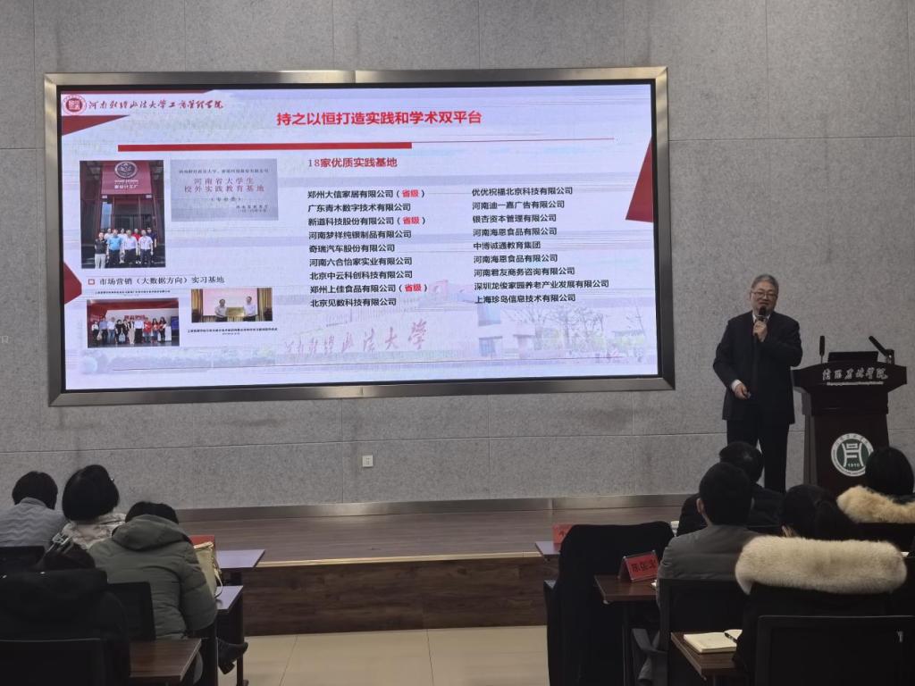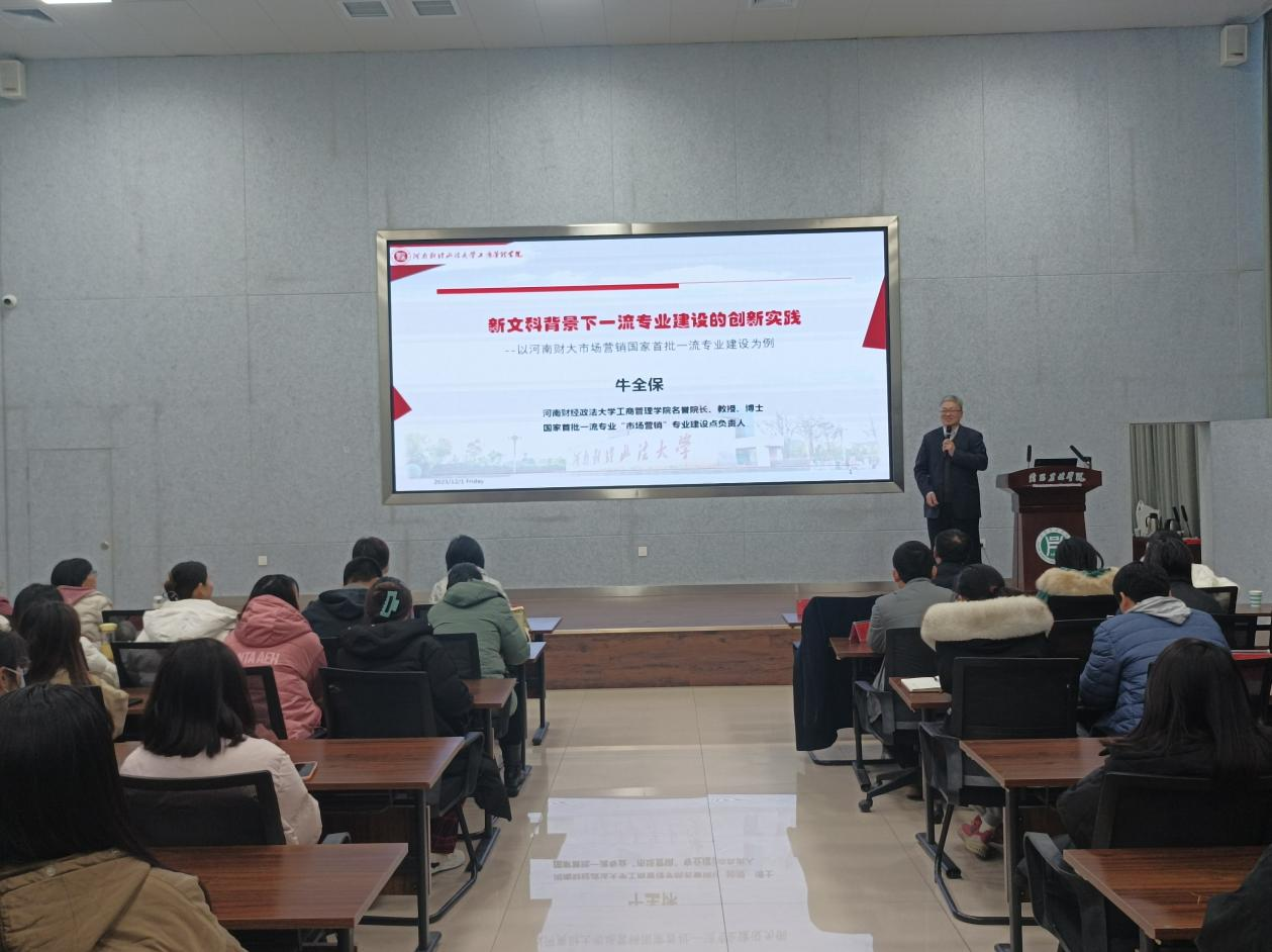 12月1日上午,物流与电商学院特邀请河南财经政法大学工商管理学院牛全保教授,在学术交流中心大学生众创空间多功能厅作了“新文科背景下一流专业建设的创新实践”的学术报告。会议由我院院长潘一平主持,学院全体老师参加了此次报告会。