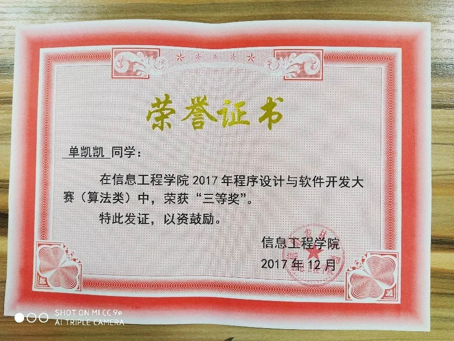 —2017年12月获得信息工程学院程序设计与软件开发大赛(算法类)比赛 三等奖