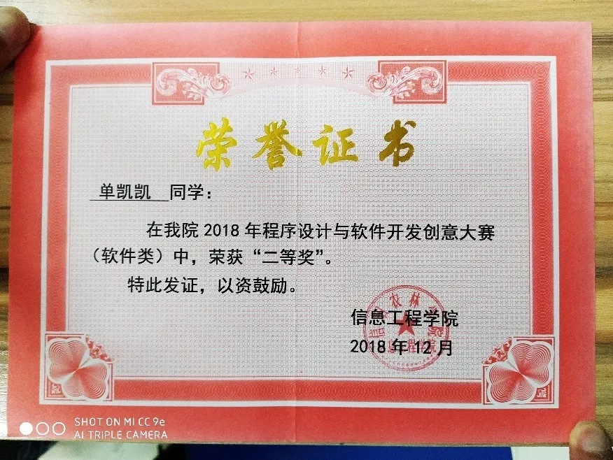 —2018年12月获得信息工程学院程序设计与软件开发创意大赛(软件类) 二等奖