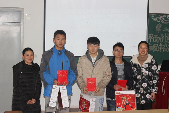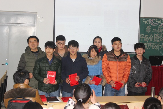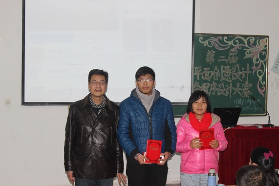 1月6日下午3:30,计算机科学系在二教205隆重举行了“第二届平面创意设计大赛”、“2014程序设计大赛”两项赛事的颁奖典礼。系副主任杜永强、团总支书记朱猛及相关专业教师参加了典礼,颁奖典礼由杜永强主持。此次大赛分设一等奖1名,二等奖2名,三等奖3名,共计12名同学获得奖励。