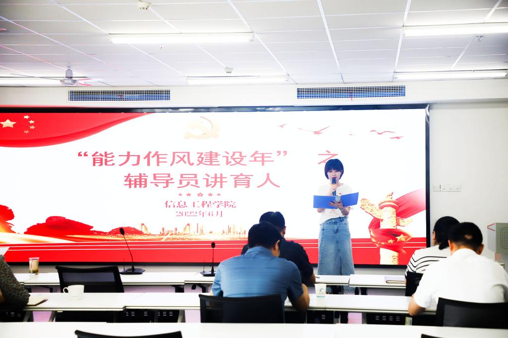 为落实“能力作风建设年”活动要求,持续推进辅导员队伍能力作风建设,提升辅导员的育人能力。6月7日下午,信息工程学院在双创618举行“辅导员讲育人”活动,大一至大三全体辅导员参加了此次活动并做汇报,院领导班子成员及各教研室主任作为评委参加此次活动。