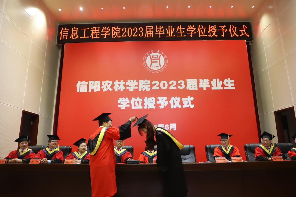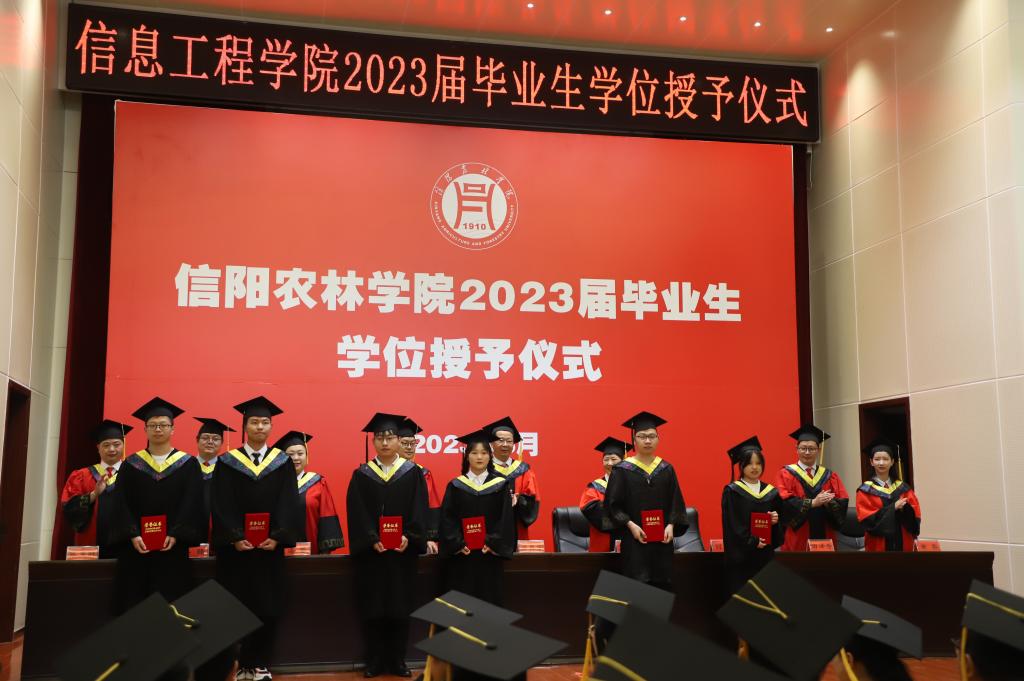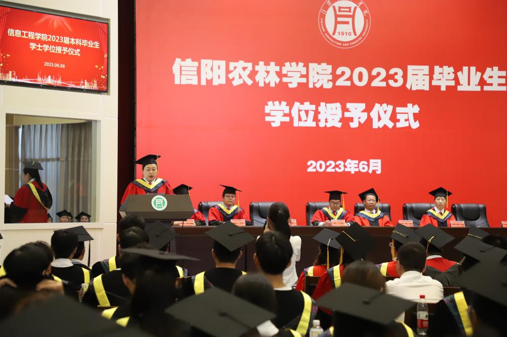 学位授予仪式在庄严的国歌声中拉开帷幕。副院长潘赟宣读了学校2023届毕业生学士学位授予决定及信息工程学院授予工学学士学位毕业生名单;副书记朱猛宣读了学院2023届优秀毕业生名单,并颁发了荣誉证书。教师代表黄蓉、毕业生代表孙一可、在校生代表刘星语先后上台作了发言。