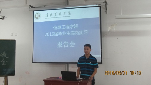 2016年5月31日,信息工程学院在二教204举行2016届毕业实习经验交流大会,2016届毕业生、2014级专科生及学院全体教师参加会议。会议由副院长杜永强主持。